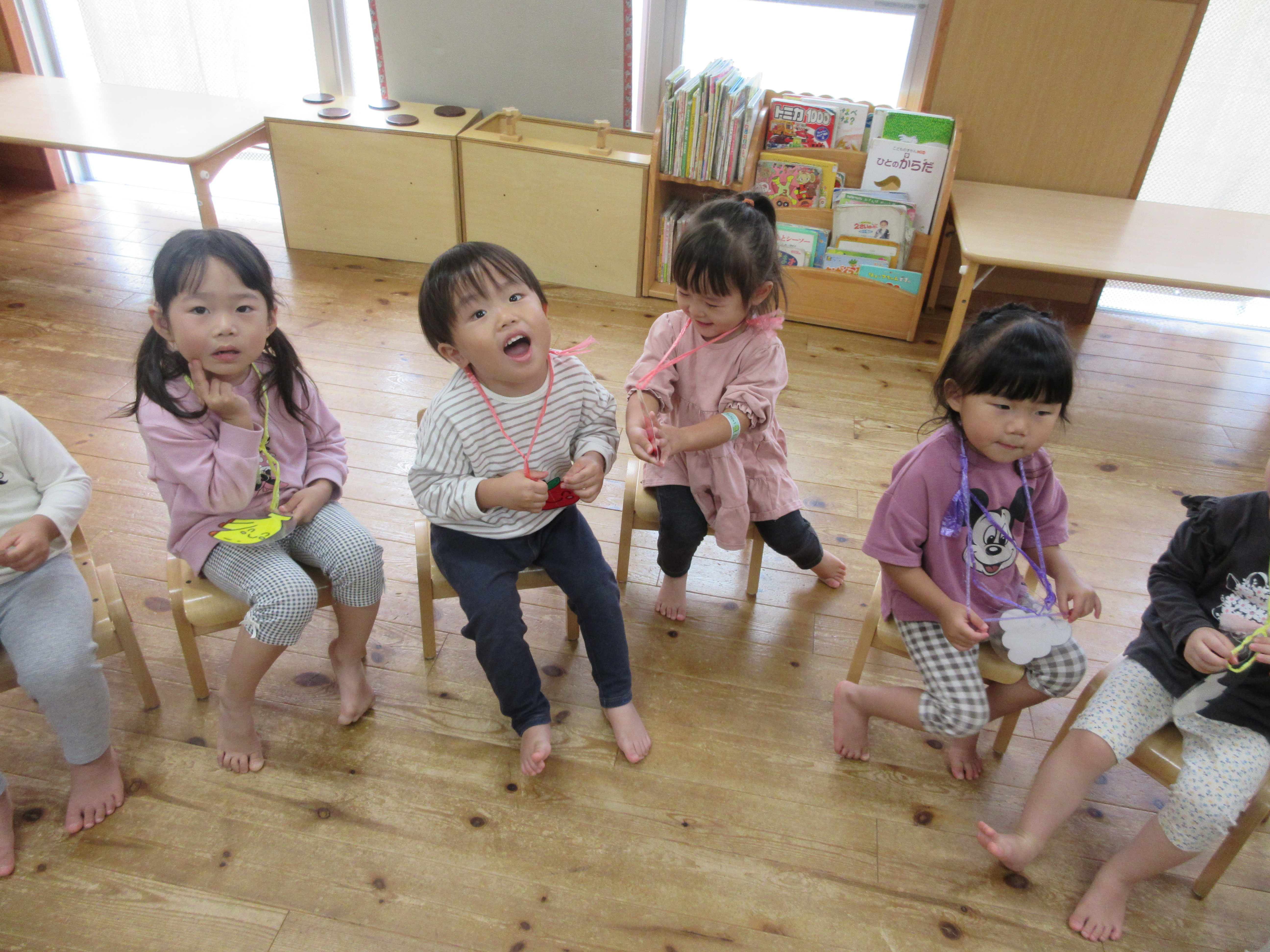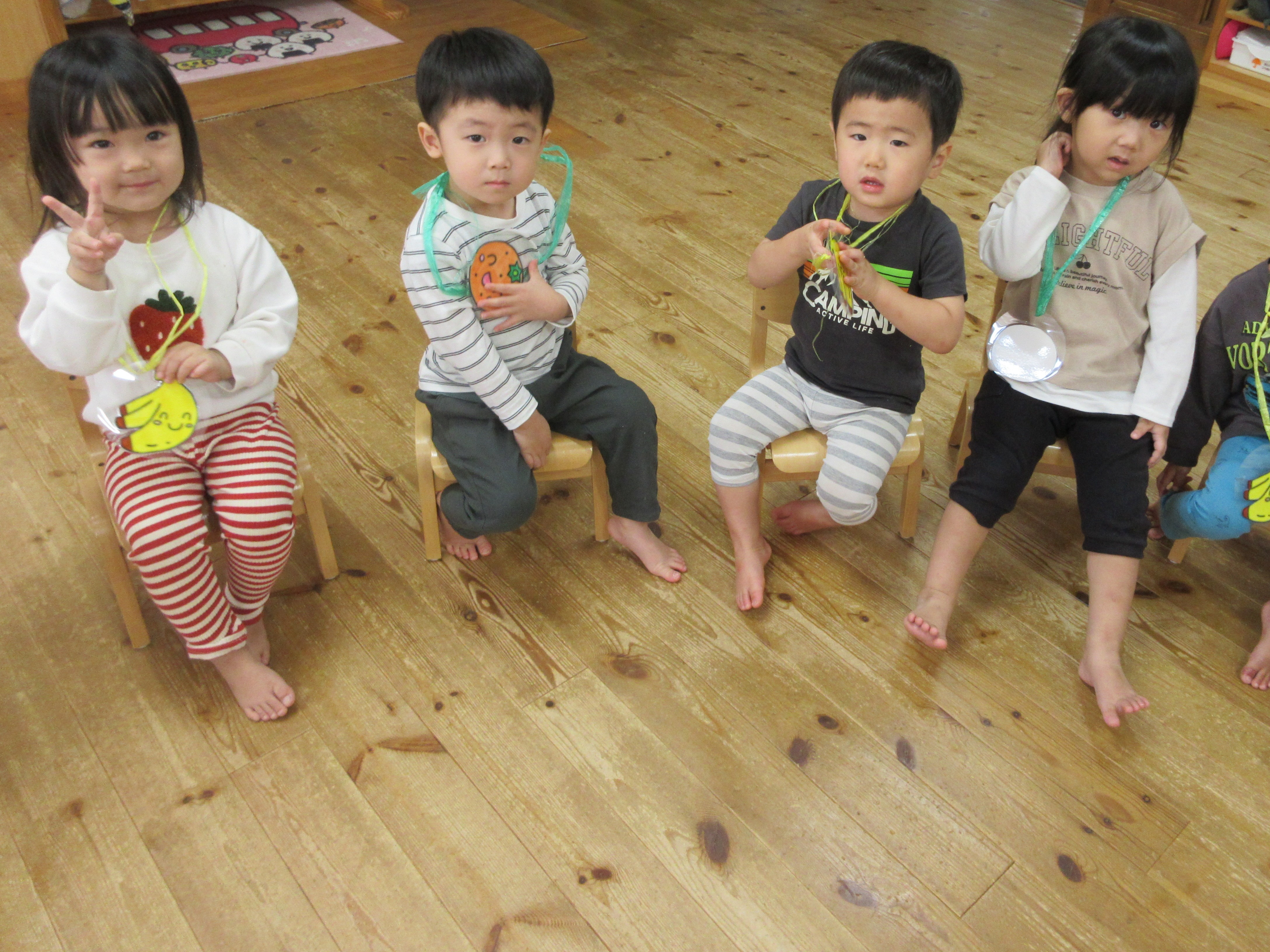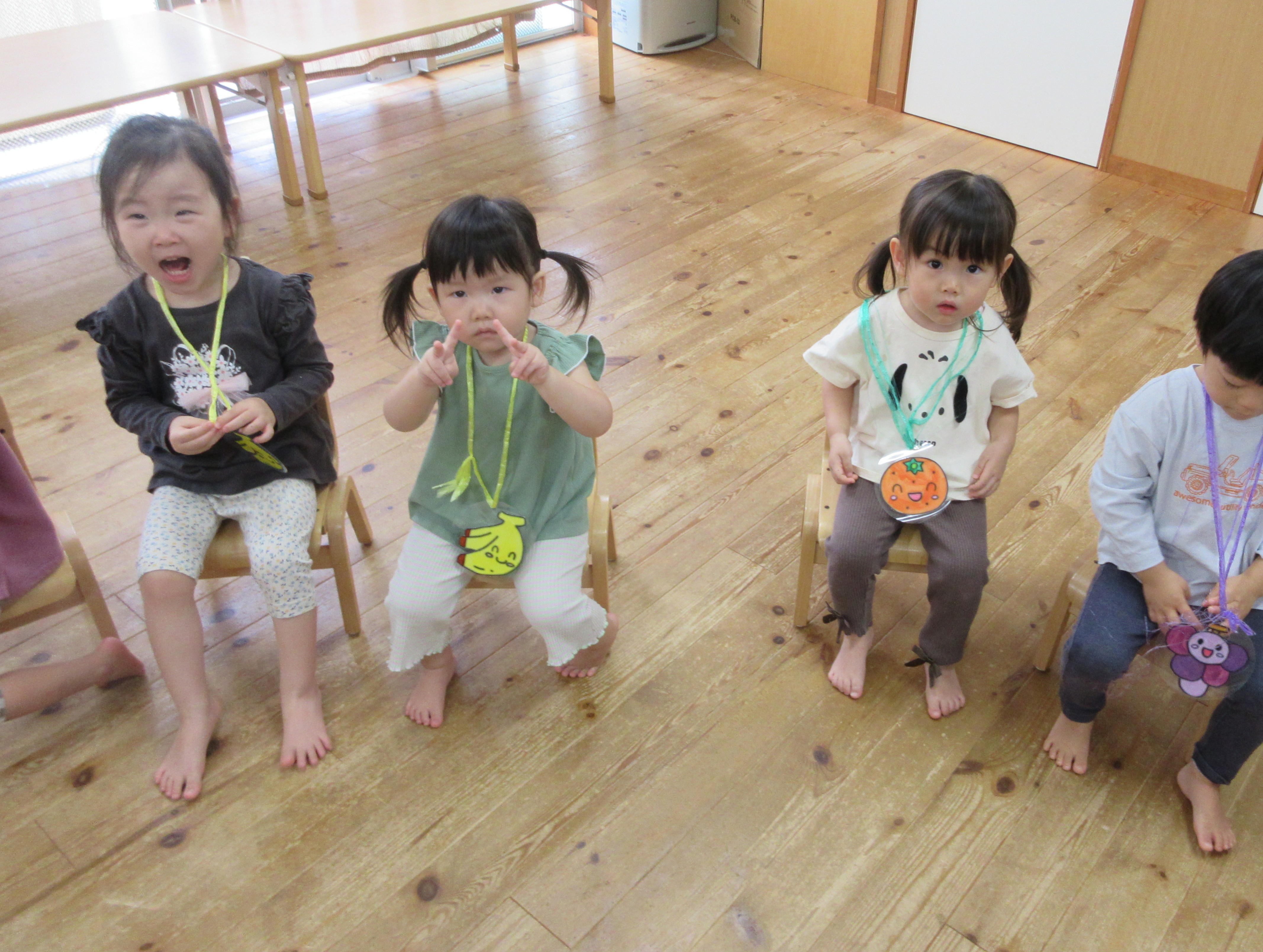 フルーツバスケットをしたよ(うさぎぐみ) 2025年 10月 21日 Tue 認定こども園 ふかつ 初めて、「フルーツバスケット」のゲームをしました。 果物の描いてあるカードを渡すと、それぞれ「りんご」「ぶどう」と喜んでいました。 何回もするうちにルールも理解して、楽しんで参加していました。 これからも色々な集団遊びをしていきたいです。 うさぎぐみ