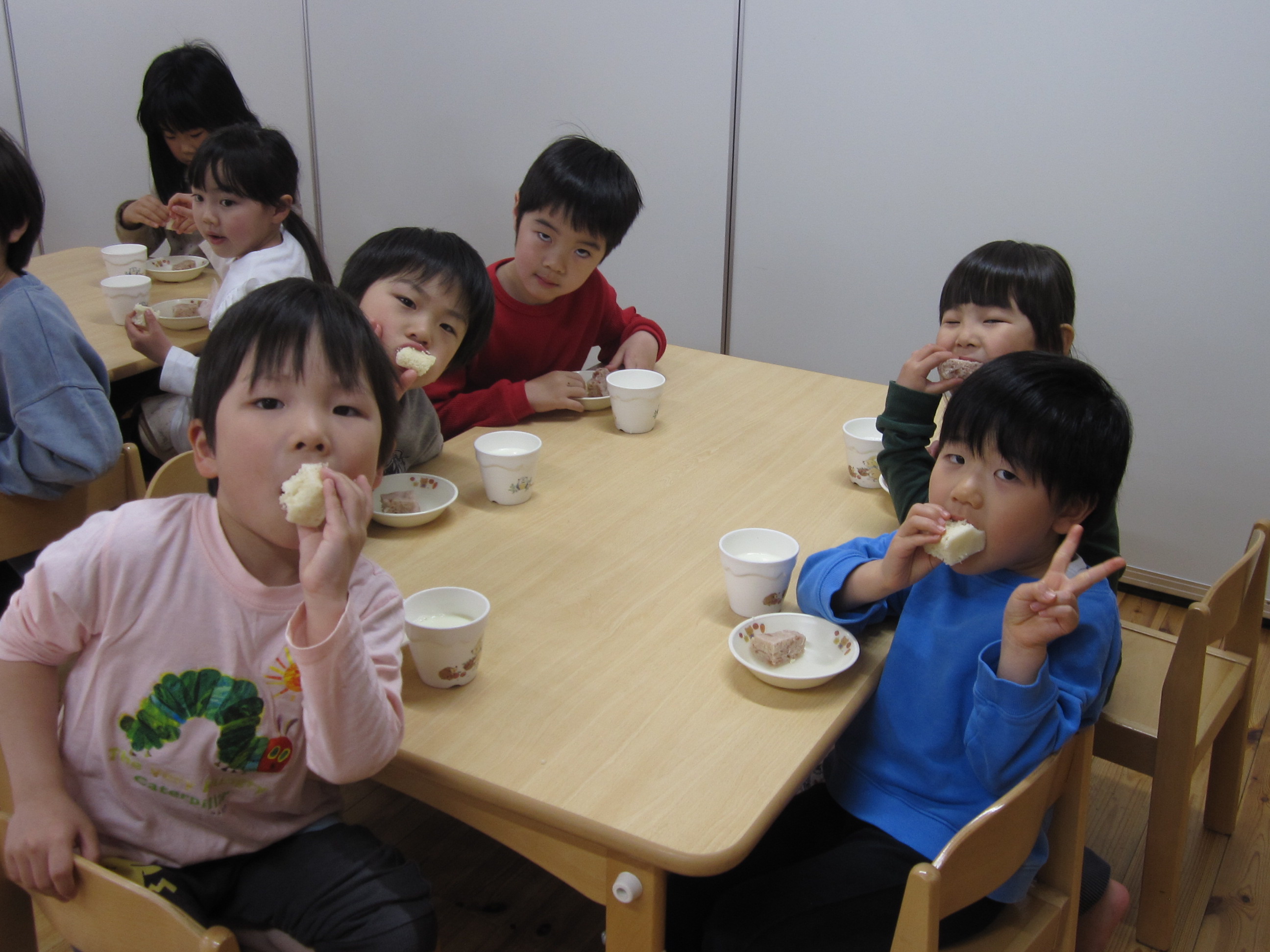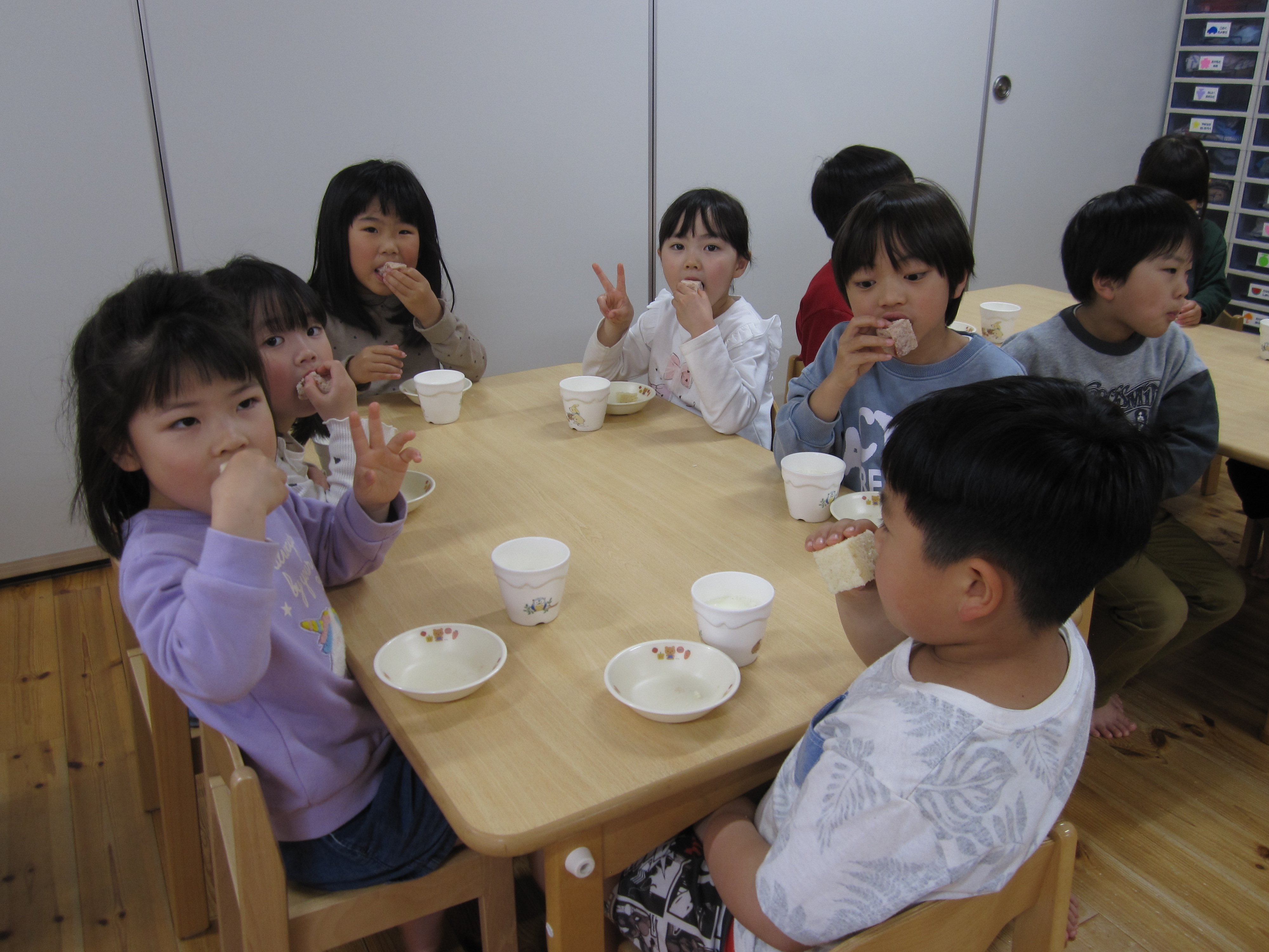 給食室より 2026年 4月 2日 Thu 認定こども園 ふかつ 4月 入園おめでとうございます 新年度を迎え、子どもたちは入園・進級の緊張感がある一方、新しい環境にわくわくしているようです。 園では、食の面でも様々なことに取り組み、子どもたちの好奇心を引き出すチャレンジをしていく予定です。 入園した子どもたちにとっては昼食を食べることも新たなチャレンジ。 園生活で豊かな食の経験をはぐくんでいきます。 今日のおやつは、紅白蒸しパンです。 子どもたち良く食べてくれました。 くまぐみ
