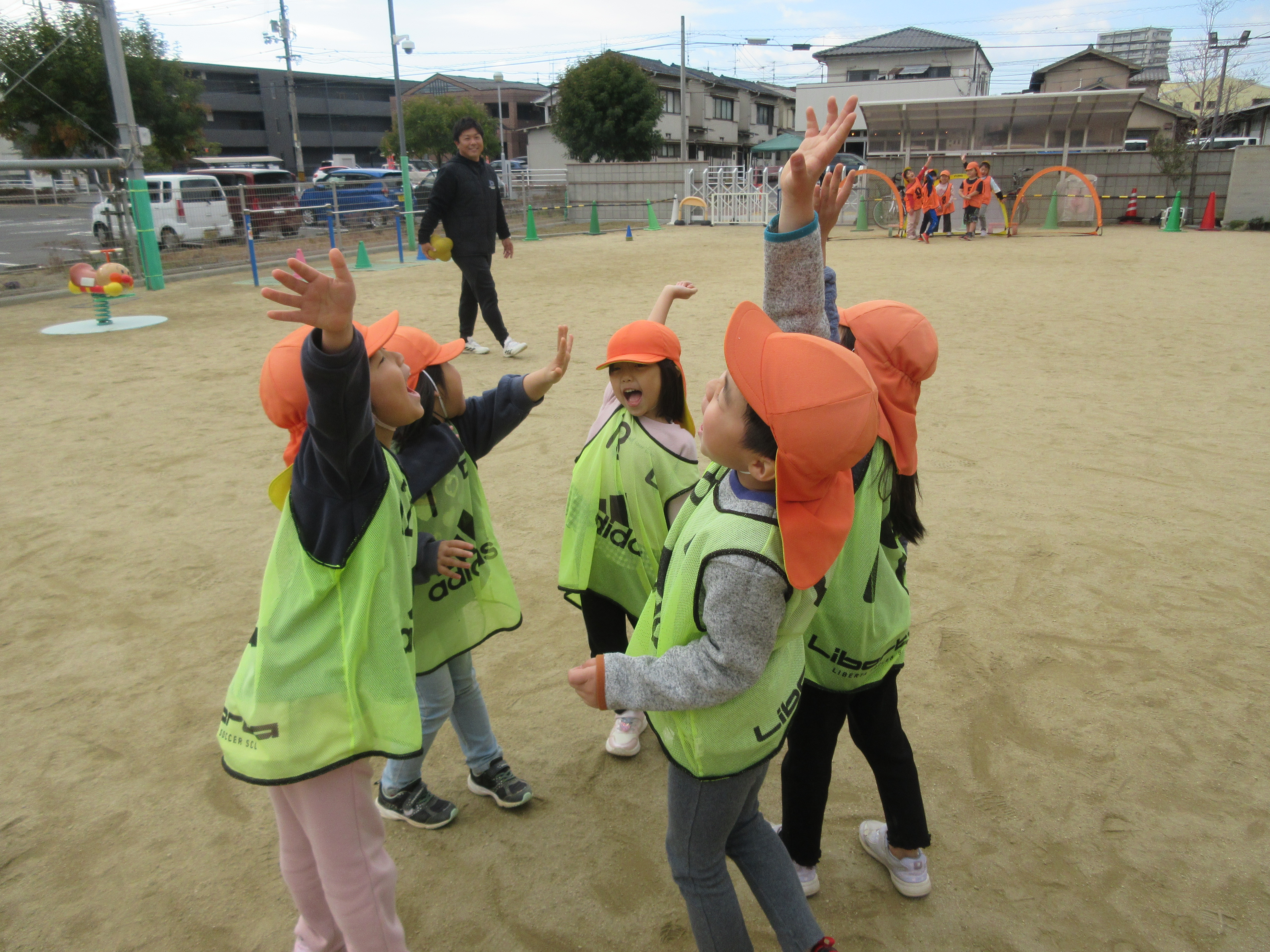 サッカー楽しいよ(くまぐみ) 2026年 1月 9日 Fri 認定こども園 ふかつ 運動会が終わってから、体操教室でサッカーを教えてもらっています。 回数を重ねていくうちに、技術面で上手になってきています。 ルールを守ることや友だちに対しての優しい気持ちも成長しています。 みんなで「エイエイオー!」をして、チームの仲間と力を合わせて頑張っています。 くまぐみ