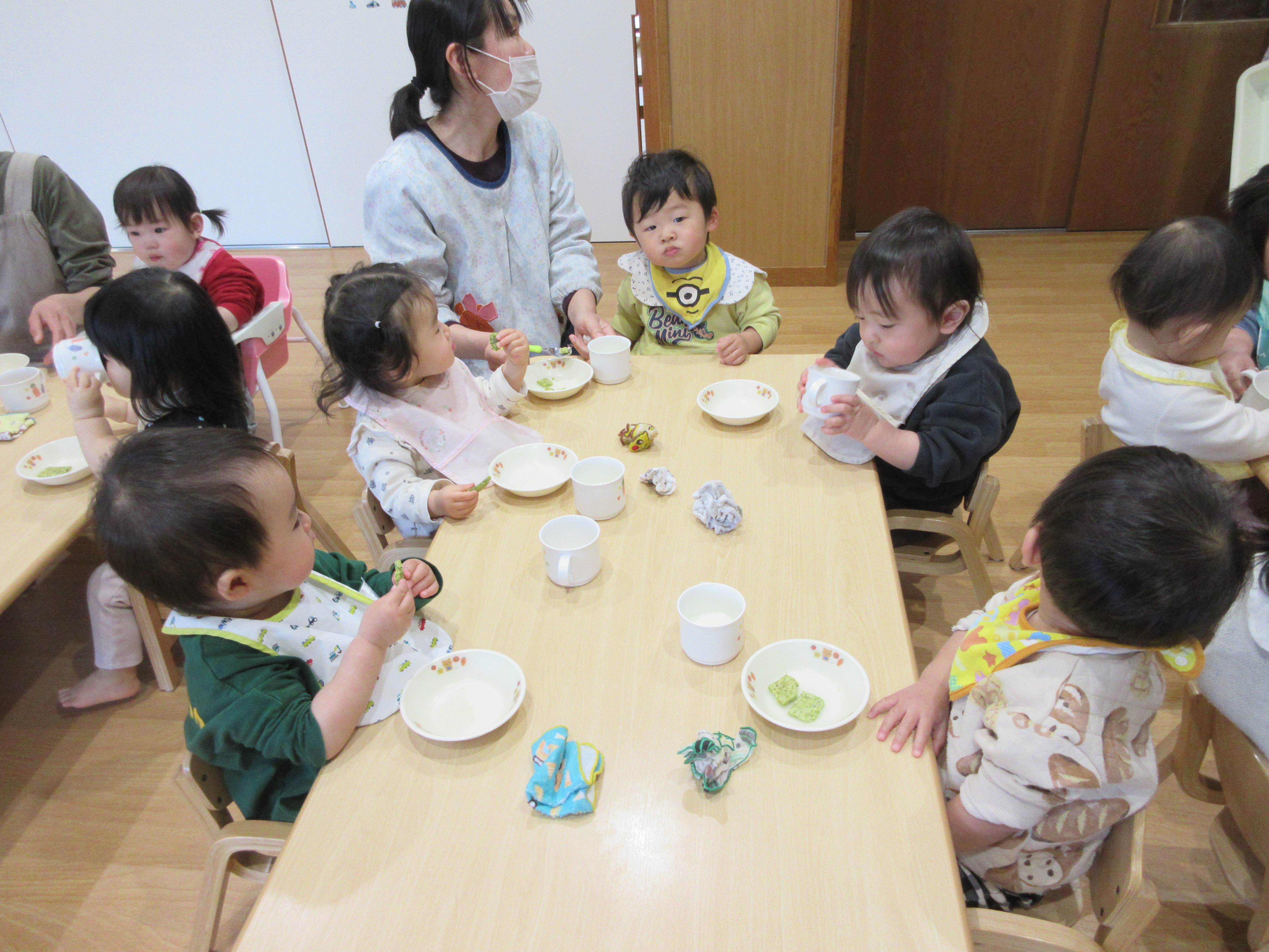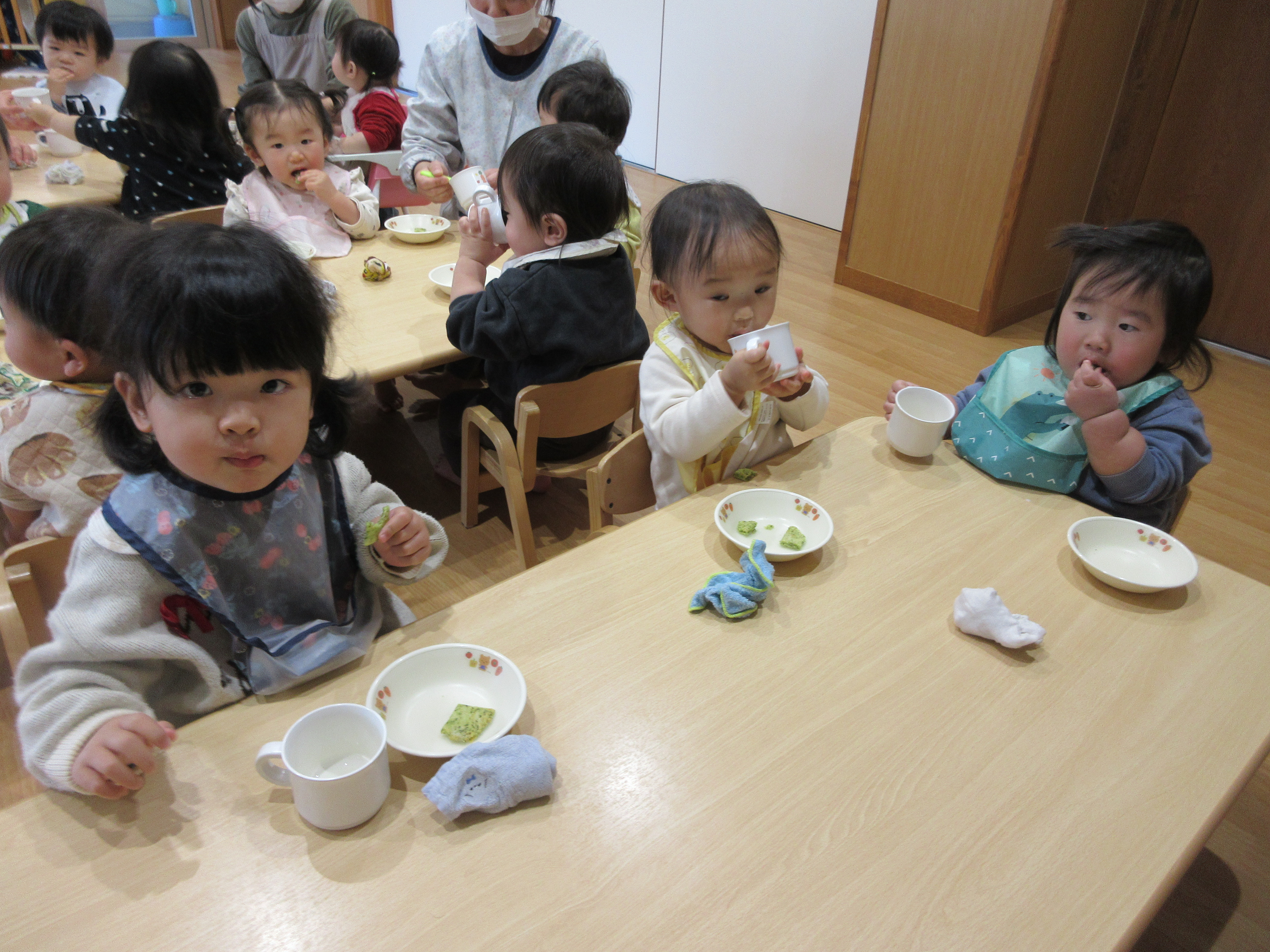 大好きなおやつの時間では、みんなニコニコ元気いっぱいで「いただきます!」と、手を合わせて挨拶をしてくれます。